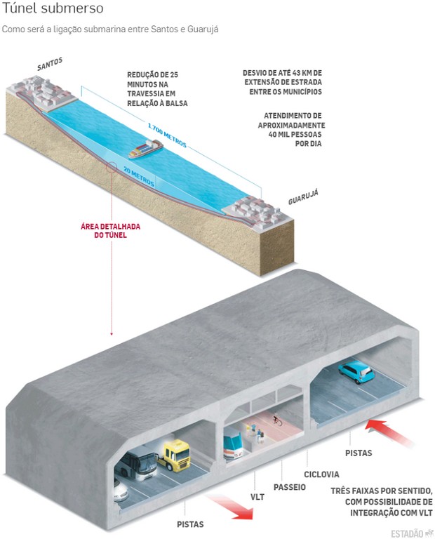 Uma das principais obras que o novo gestor privado do porto de Santos terá de assumir é a construção de um túnel submerso que vai ligar as cidades de Santos e Guarujá. Hoje, esse caminho é feito por estrada, em um trecho de 43 quilômetros de extensão. Outra opção é cruzar os municípios por meio de uma balsa. Já o túnel submerso terá apenas 1,7 quilômetros de extensão.