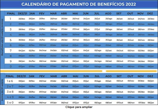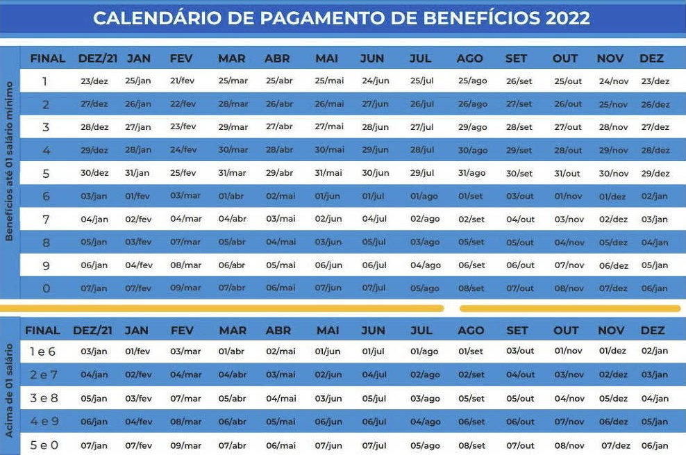 As datas foram definidas no calendário anual de pagamentos para 2022, divulgado pelo INSS em 1º de dezembro. Os dias exatos do primeiro depósito com reajuste anual, referente à competência de janeiro, variam conforme o final do benefício, sem o dígito que aparece depois do traço. Veja abaixo.