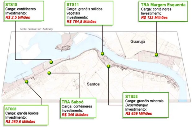 As áreas a serem leiloadas - STS53, STS08, STS11, STS10 e Terminais Retroalfadengados (TRA) Saboó e Margem Esquerda - estão espalhadas por Alemoa, Outerinhos, Paquetá, Saboó e Guarujá. Elas serão ocupadas por terminais de contêineres e granéis vegetais, líquidos e minerais.