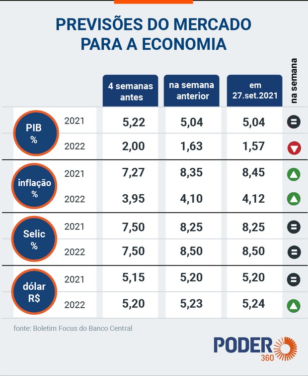 As estimativas foram divulgados na última 2ª feira (20.set.2021) no Boletim Focus do Banco Central. Eis a íntegra do relatório. O Boletim Focus é divulgado semanalmente com as perspectivas dos operadores do mercado em relação aos principais indicadores da economia.