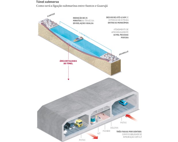 Uma das principais obras que o novo gestor privado do porto de Santos terá de assumir é a construção de um túnel submerso que vai ligar as cidades de Santos e Guarujá. Hoje, esse caminho é feito por estrada, em um trecho de 43 quilômetros de extensão. Outra opção é cruzar os municípios por meio de uma balsa. Já o túnel submerso terá apenas 1,7 quilômetros de extensão.