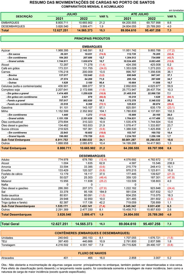 O desempenho da movimentação de cargas no mês de julho e no acumulado dos sete primeiros meses do ano no Porto de Santos atingiu índices de crescimento significativos. Apresentando aumento contínuo no acumulado do ano, o Porto totalizou 95,5 milhões de toneladas, aumento de 7,3%, a maior marca para esse período. O resultado de julho totalizou 14,5 milhões de toneladas (melhor marca para esse mês), 15,3% acima do mesmo período de 2021.