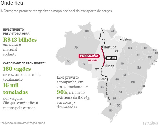 Com quase mil quilômetros de extensão ligando Sinop, em Mato Grosso - o maior centro produtor de grãos do País - a Itaituba, no Pará, onde se localizam terminais de exportação, a Ferrogrão tem um investimento (capex) estimado pelo governo em cerca de R$ 8,5 bilhões - que pode chegar, segundo estimativas de mercado, a cerca de R$ 13 bilhões, incluindo obras e equipamentos. A previsão é transportar cerca de 21 milhões de toneladas de carga no primeiro ano de operação e 51 milhões de toneladas no trigésimo ano. O prazo de concessão é de 69 anos.