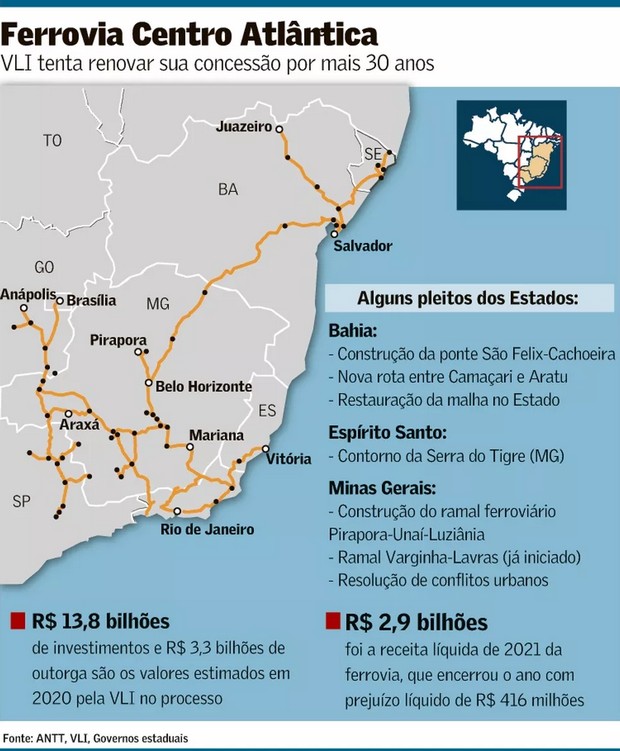 O objetivo é prorrogar o contrato, que venceria em 2026, por mais 30 anos. Em troca, o grupo deverá fazer R$ 13,8 bilhões de investimentos na malha e pagar mais R$ 3,3 bilhões de outorga. Estes recursos seriam destinados a outras obras, como a dos trechos 2 e 3 da Ferrovia de Intergração Oeste Leste (Fiol). Os valores foram apresentados em 2020, e agora deverão ser revistos.