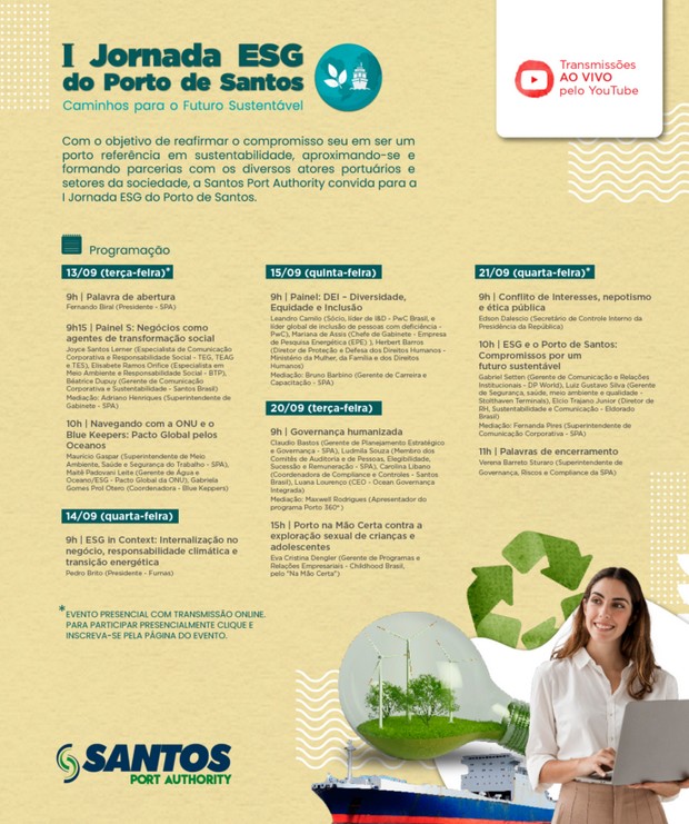 A Santos Port Authority (SPA) realiza entre os dias 13 e 21 de setembro a I Jornada ESG do Porto de Santos, que ocorrerá em formato híbrido, com abertura e encerramento presenciais e online. Nos dias 14, 15 e 20 as palestras e mesas-redondas poderão ser acompanhadas exclusivamente pela internet, bastando clicar nos links disponíveis na programação.